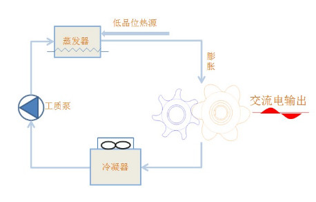 基于有機(jī)郎肯循環(huán)(Organic Rankine Cycle簡稱ORC)原理,利用低品位熱源產(chǎn)生動(dòng)力:通過低沸點(diǎn)有機(jī)工質(zhì)獲取其他介質(zhì)的熱能,轉(zhuǎn)化為壓力能,通過膨脹機(jī)將壓力能轉(zhuǎn)化為機(jī)械能,最終通過發(fā)電機(jī)將機(jī)械能轉(zhuǎn)化為電能。